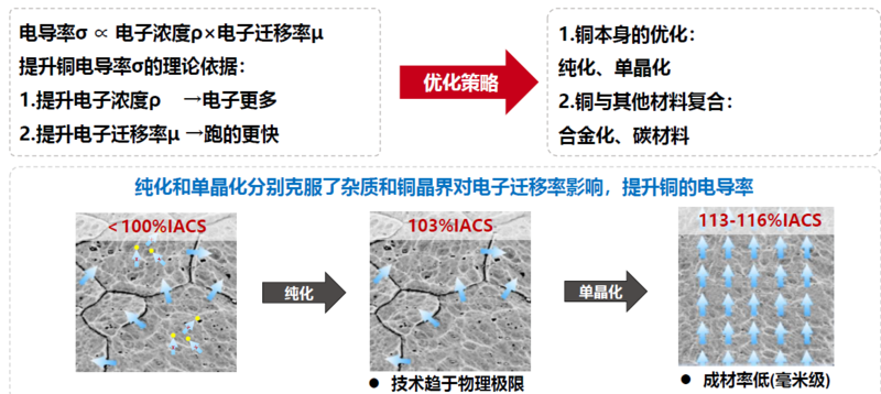 纯化和单晶化分别克服了杂质和铜晶界对电子迁移率影响,提升铜的电导率。