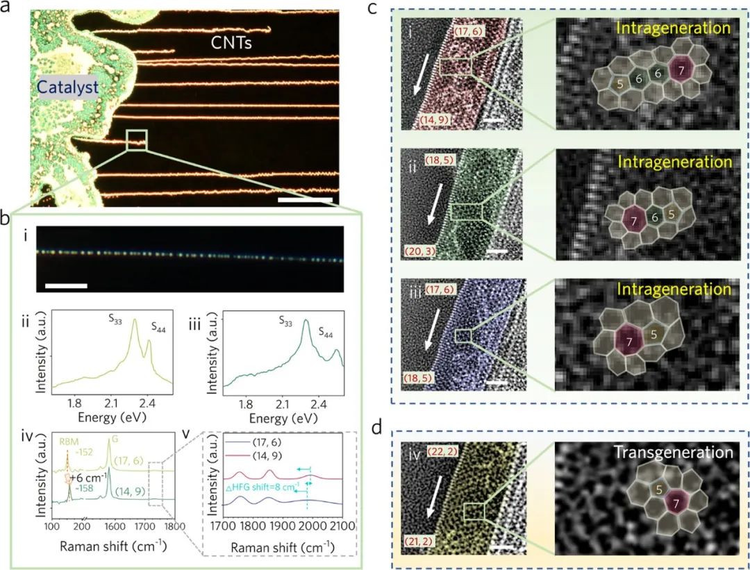 对称性是自然界的核心规律,对称性和对称性破缺现象广泛存在于生物和非生物体系中。单壁碳纳米管(SWNTs)作为一种典型的非对称生长手性材料,研究其生长机制对于实现超长且性能均一的碳纳米管的可控制备至关重要。近日,清华大学魏飞团队将碳纳米管与脱氧核糖核酸(DNA)结构关联,揭示了SWNTs生长中对称及对称性破缺现象,且发现缺陷具有记忆性。