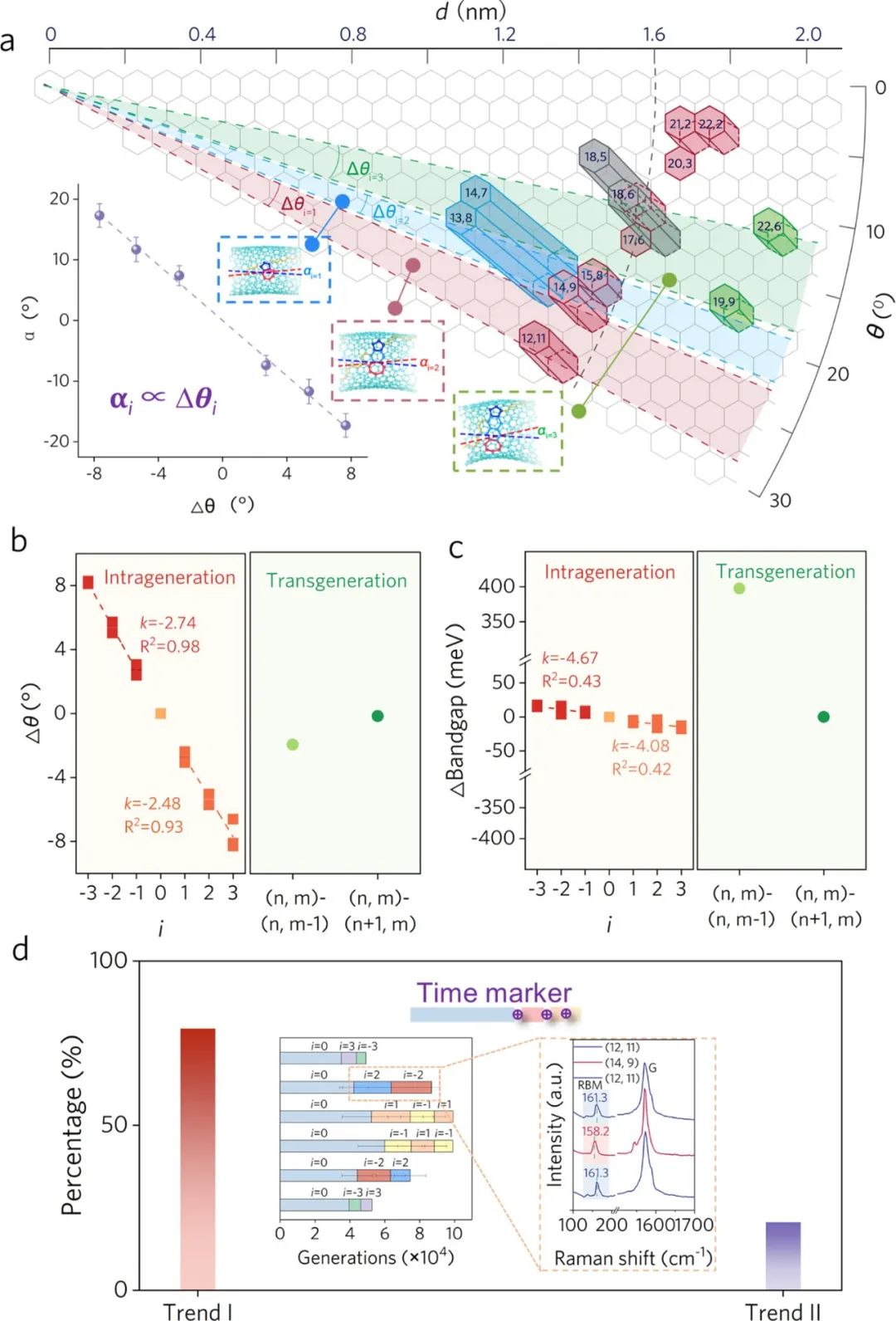 这项工作从变异角度揭示了SWNTs生长过程中的对称性破缺现象及其记忆保留特征,这一研究加深了对碳纳米管生长进化生长过程中缺陷特征和规律的理解,为碳纳米管的可控合成提供了全新视角,并进一步揭示了材料突变机制与性质调控之间的深刻联系。此外,它为生物和非生物系统中记忆的起源提供了新的研究证据。