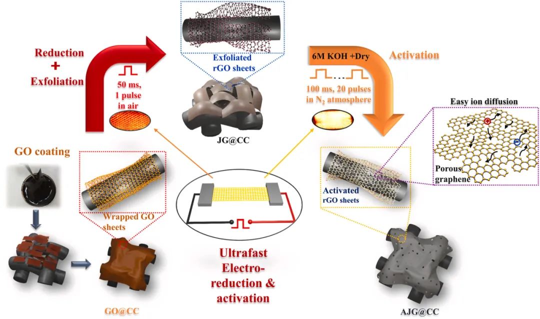图1展示了利用瞬态焦耳加热(TJH)方法实现氧化石墨烯(GO)在碳布(CC)上的原位还原和激活过程。该过程首先通过连续的浸涂和干燥方法在CC上涂覆GO,然后通过施加短暂的电流脉冲(50毫秒)实现GO到还原氧化石墨烯(rGO)的快速还原,同时形成了非堆叠的大孔结构(JG@CC)。此外,通过在JG@CC电极上施加一系列超短电流脉冲(100毫秒),实现了石墨烯基平面的快速碱激活,从而在rGO基平面内创造了大量纳米孔,生成了活化的JG@CC(AJG@CC)。这一过程不仅提高了石墨烯片的导电性,而且增加了JG@CC的有效表面积。图1中的示意图详细描述了这一独特的TJH方法,展示了从GO到AJG@CC的转变过程。