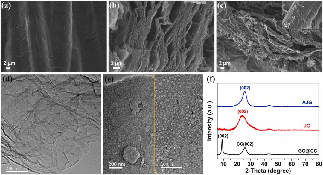 图2通过场发射扫描电子显微镜(FESEM)和透射电子显微镜(TEM)图像,展示了经过焦耳加热处理后电极的形态演变和基平面穿孔情况。GO@CC的FESEM图像显示了CC上的均匀GO薄膜。经过首次50毫秒电流脉冲处理后,薄膜颜色变为深黑色,表明GO热还原为石墨烯。高倍数FESEM图像揭示了JG@CC的高开放多孔结构,具有层间微/宏观孔。而AJG@CC的形态保持了与JG@CC相似的开放大孔形态。TEM图像进一步显示了JG@CC样品的石墨烯呈现出无基平面孔洞的皱褶片状结构,而经过超快激活后,AJG样品中出现了高度多孔的片层,平均孔径约为6纳米。XRD分析结果表明,经过TJH处理后,GO成功还原为石墨烯,恢复了晶体石墨结构。
