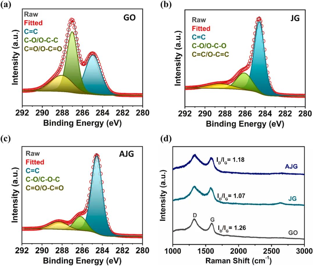 图3通过拉曼光谱和X射线光电子能谱(XPS)分析了不同处理阶段电极表面官能团的性质和石墨结构的修饰。GO、JG和AJG的高分辨率C 1s XPS光谱显示了三个显著的峰,分别对应于sp2碳、羟基/环氧基和羧基。JG中与官能团相关的峰强度显著降低,证实了GO在超快焦耳加热过程中还原为rGO。激活后,AJG中羟基/环氧基峰面积和强度相对于JG有所减少,而羧基峰的强度和面积略有增加,表明在电热KOH激活过程中引入了一些额外的-COOH基团。拉曼光谱显示,经过脉冲焦耳加热处理后,GO的D和G峰位置发生了变化,表明石墨烯结构的成功还原和缺陷的增加,这些缺陷可能与纳米孔的引入有关。