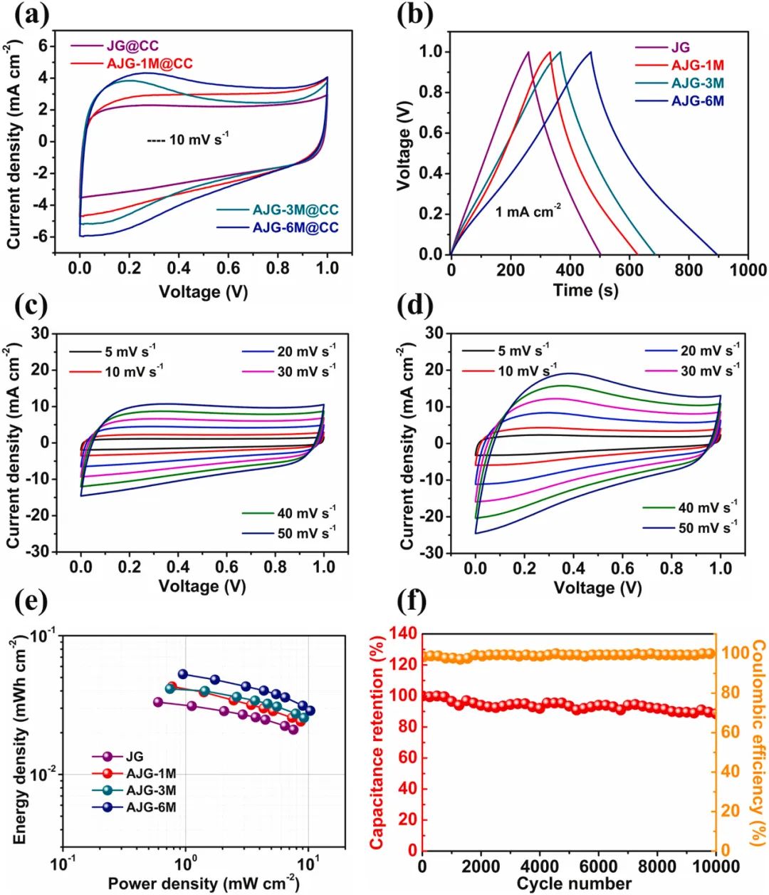 图4展示了由JG@CC和AJG@CC电极制成的对称超级电容器设备在不同扫描速率下的循环伏安(CV)曲线和恒流充放电(GCD)曲线。AJG@CC电极在不同KOH浓度激活下显示出显著的电容差异,其中6M KOH激活的AJG@CC电极在5 mV s⁻¹时面积比电容最高,达到380.2 mF cm⁻²。Ragone图显示,AJG@CC基超级电容器的最大能量密度为52.8 μWh cm⁻²,远高于非激活样品。此外,经过10000次充放电循环后,设备仍保持92%的容量,显示出优异的循环稳定性。
