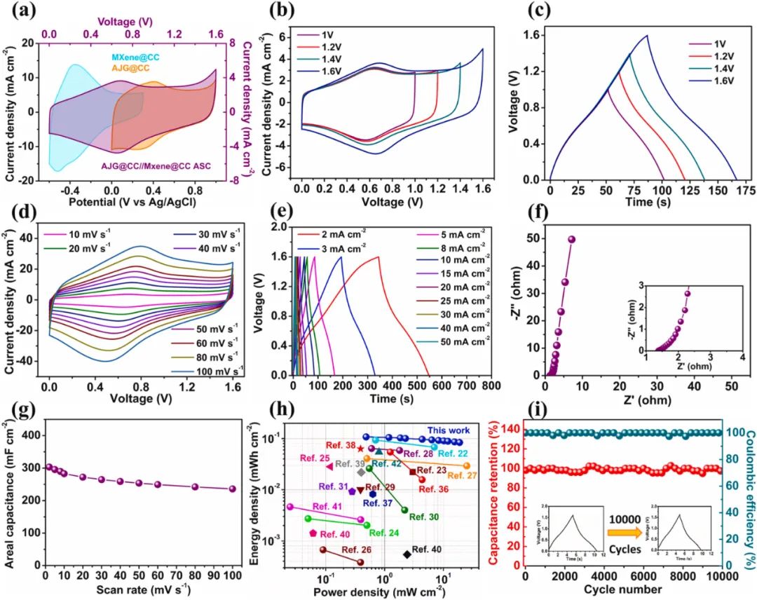 图5展示了AJG@CC//MXene@CC不对称超级电容器设备的电化学性能。该设备在1.6V的扩展操作电位窗口下工作,利用了正极AJG@CC和负极MXene@CC的稳定性窗口。在不同的电压窗口下,设备的CV和GCD曲线显示出良好的稳定性和可逆性。电化学阻抗谱(EIS)结果显示,设备具有快速的电荷转移和离子扩散能力。在2 mV s⁻¹的扫描速率下,设备展现出最大的面积电容303.1 mF cm⁻²,并且在100 mV s⁻¹的高扫描速率下仍保持了77%的容量保持率。此外,设备在485 μW cm⁻²的功率密度下能提供最大能量密度107.77 μWh cm⁻²,即使在4404.54 μW cm⁻²的高功率密度下,能量密度仍保持在83.88 μWh cm⁻²。经过10000次充放电循环后,设备能保持94%的初始电容和100%的库仑效率,显示出卓越的电化学稳定性。