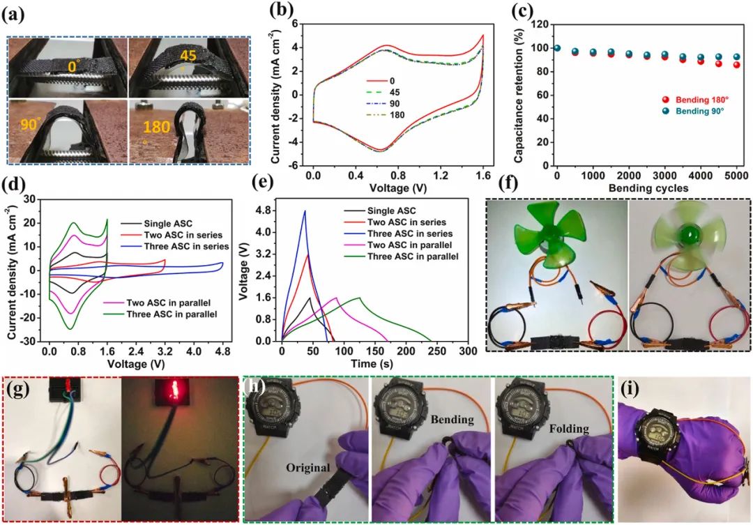 图6展示了MXene@CC//AJG@CC不对称超级电容器在不同弯曲条件下的性能。数字照片显示了设备在45°、90°和180°不同弯曲角度下的情况,证明了设备的柔韧性和稳定性。CV曲线显示,在极端弯曲条件下,设备的性能几乎不受影响。经过5000次90°和180°的连续弯曲循环后,设备仍保持了近90%的容量,显示出出色的耐用性。此外,通过将两个或三个设备串联或并联连接,可以实现所需的电压窗口(例如3.2V和4.8V)和电流。实际应用中,设备能够为电子设备如风扇、LED灯和数字手表提供电力,即使在重复弯曲条件下也能保持性能不变,证明了MXene@CC//AJG@CC不对称超级电容器作为可穿戴电子设备可靠电源的潜力。