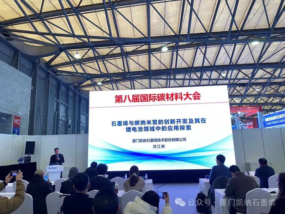 在这场汇聚全球碳材料产业链上下游厂家的盛会中,厦门凯纳石墨烯技术股份有限公司作为国内石墨烯产业化的领军企业参与了此次盛会,凯纳技术负责人洪江彬副总经理发表了题为“石墨烯与碳纳米管的创新开发及其在锂电池领域中的应用探索”的精彩报告。