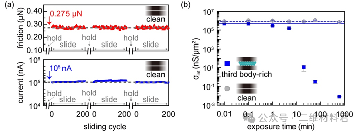 Figure 2展示了清洁界面和富含第三体的石墨/石墨接触界面的摩擦与电导特性对比。
