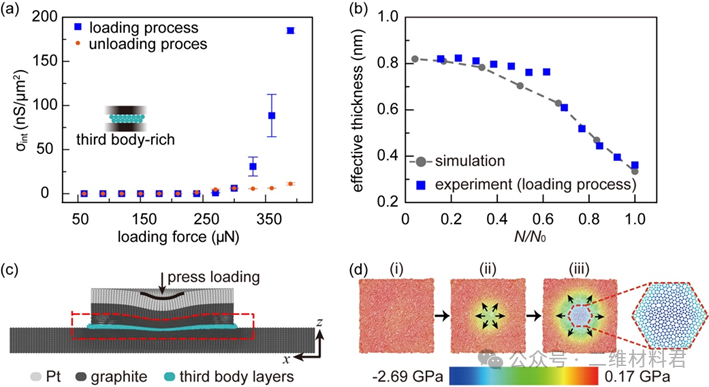 本研究提出了量子隧穿有效厚度模型,以解释第三体层在滑动过程中的形态变化及其对界面导电性能的影响。Figure 3展示了对有效厚度模型有效性的验证。
