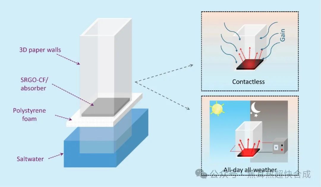 1.材料制备:采用聚焦太阳光将氧化石墨烯(GO)还原为太阳还原氧化石墨烯(SRGO),并将其涂覆于碳纤维(CF)上制成光热加热器,通过滤纸与支撑结构构建三维非接触式蒸发器。