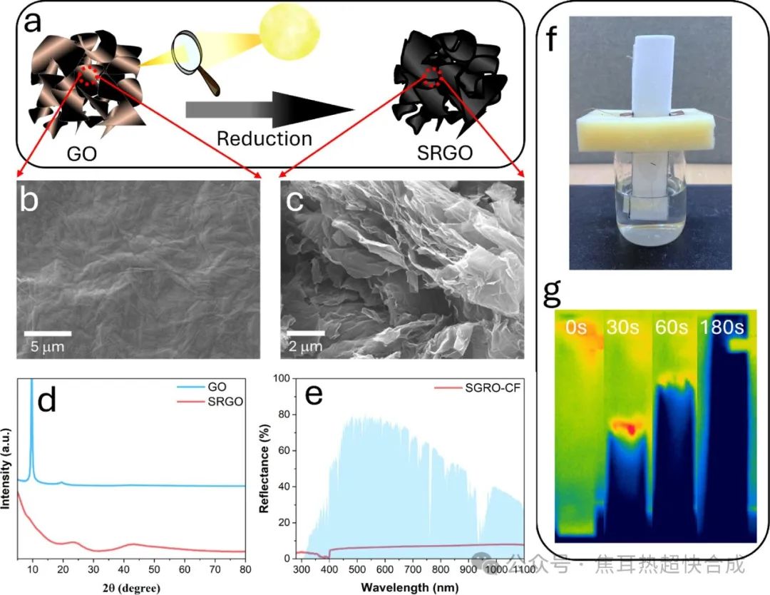 2.性能测试:通过XRD和XPS表征材料结构与性能,使用光谱测试SRGO的光吸收能力,并利用红外热成像仪测量蒸发器的温度分布和热效率。