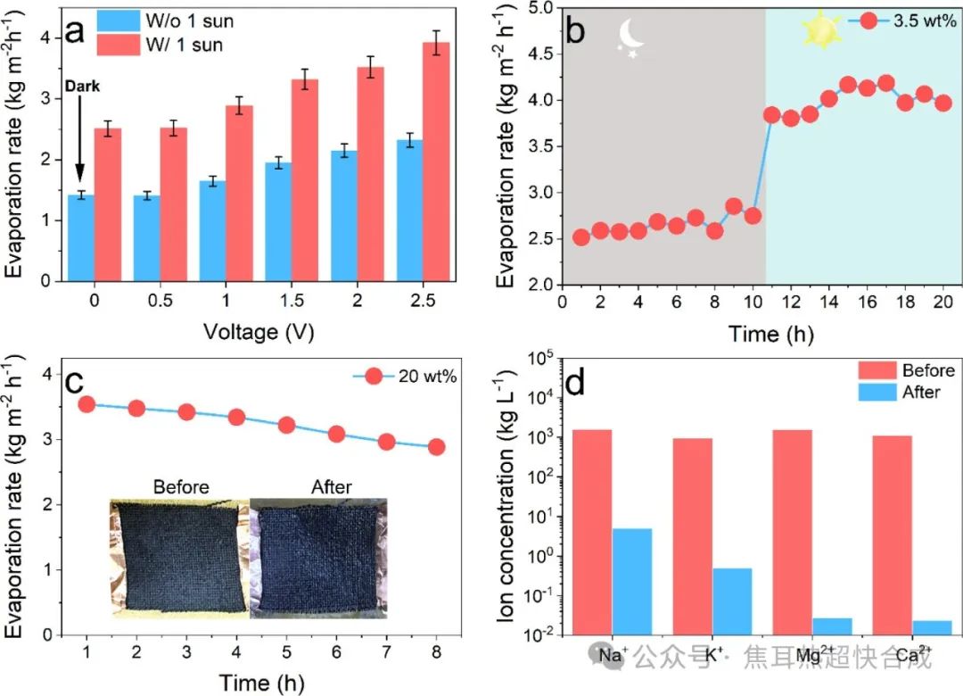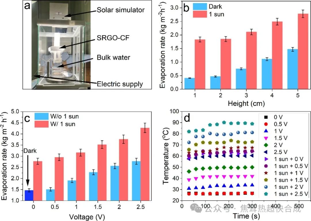 1.高效蒸发性能:在1个太阳光照和2.5 V输入电压条件下,蒸发速率达到4.27 kg/m²·h,比传统方法高出约150%;在无光条件下,依靠焦耳加热蒸发速率仍可达2.32 kg/m²·h。