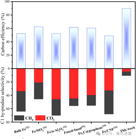 3.优化催化剂性能:优化的χ-Fe5C2@石墨烯催化剂表现出仅4.6%和5.9%的CO2和CH4生成,达到了约90%的高碳效率,有望推动Fe基纳米复合催化剂在费托合成中的高效应用。