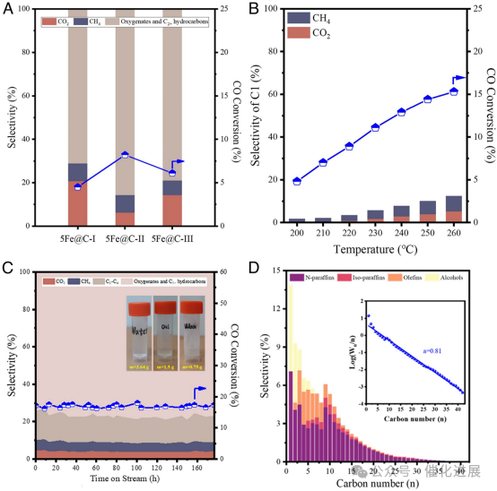 图2D:催化产物分析显示,5Fe@C-II催化剂对长链烃的生成具有较高的概率,α值为0.81,同时对醇类化合物也表现出显著的选择性,达到约15%。