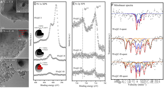 图3D-E:XPS分析显示,随着煅烧温度的升高,氮元素消失,支持了石墨化过程的进行。5Fe@C-II催化剂表面未检测到铁,表明石墨烯层完全包裹了铁碳化物或铁纳米颗粒,形成了完美的核壳结构。