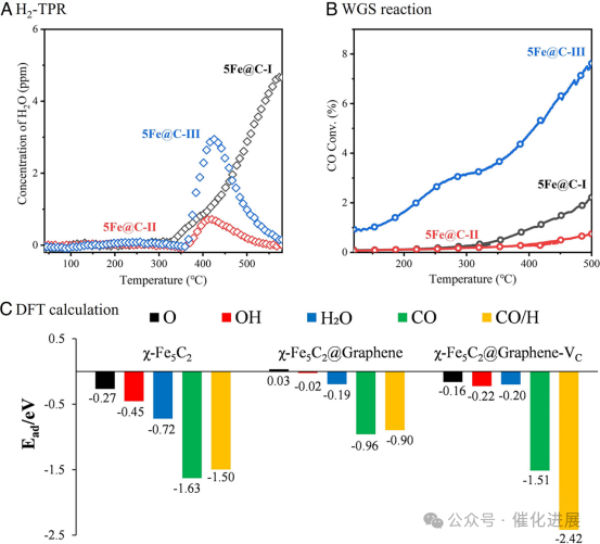 图4C:DFT计算结果显示,石墨烯层对χ-Fe5C2表面的OHx、CO和CO/H物种的吸附能量有显著影响,弱化了OHx的吸附强度,而对CO和CO/H的吸附保持强烈。碳空位(VC)使得CO和CO/H在石墨烯层内的吸附更强,而OHx吸附转移至Fe位置,进一步抑制了WGS反应。