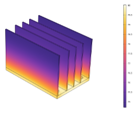 图 2:除底座外,电子散热器的所有表面都涂有 THERMAL-XR® 的模型显示,达到的最高温度降低了 23%。