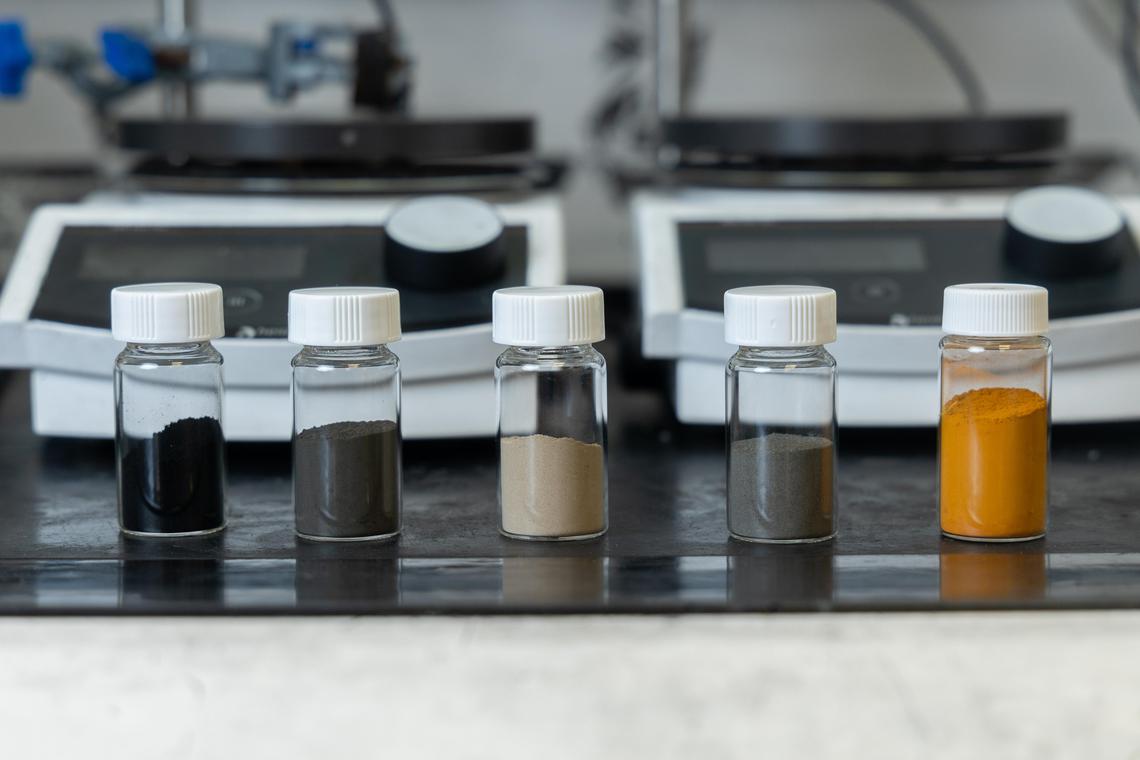 左起:碳烟、未加工的碳烟灰、完成化学浸出和球磨的碳烟灰、碳烟灰吸附剂、五氧化二钒(vanadium pentoxide)。(吴先邦摄)