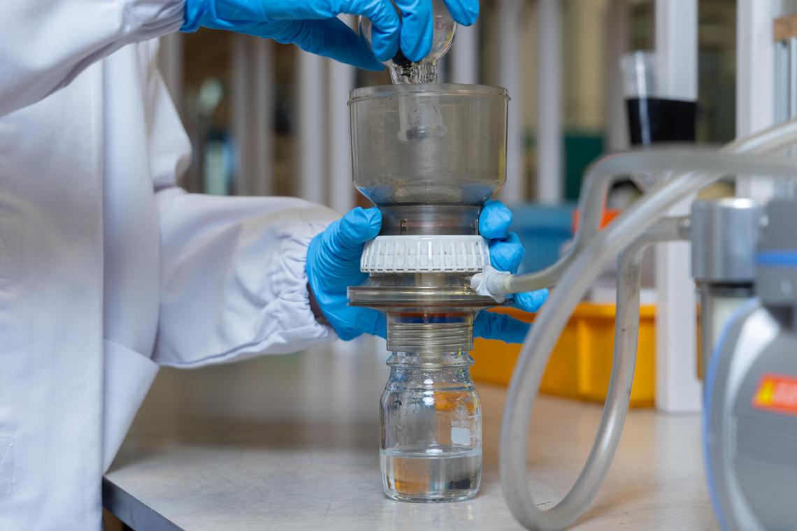 完成搅拌后,废水中的铅离子彻底清除,通过过滤便可将吸附着铅离子的碳烟灰和净水分离。(吴先邦摄)