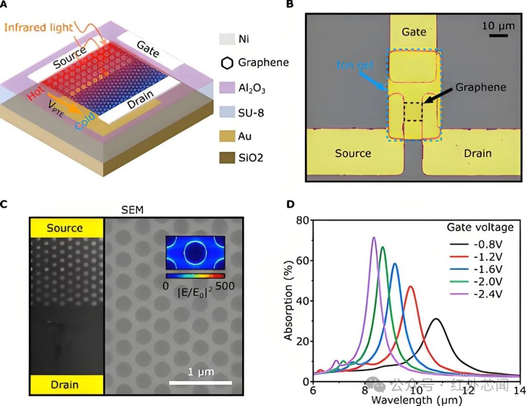 基于大面积CVD生长石墨烯的长波红外探测器的结构如图1A所示。在长波红外照明下,光腔模式和图案化石墨烯上的Dirac局域等离激元之间的相干相互作用大大提高了纳米图案化石墨烯(NPG)层中长波红外的吸收约30倍。在石墨烯电极上形成3端子场效应晶体管(FET),如图1A所示。图1B为该探测器的显微图像,图1C为该器件的扫描电子显微镜(SEM)图像。图1D展示了6 μm至14 μm波段图案化石墨烯吸收光谱的动态调谐与栅极电压的函数关系。