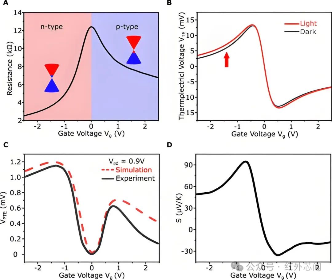 石墨烯层中的载流子温度梯度是通过吸收不对称引起的,该方法是将石墨烯层的一半用六边形孔阵列进行图案化,而将另一半不进行图案化。该探测依靠光热电效应将载流子温度的不对称性转化为电信号。图2A为栅极相关电阻变化,n型和p型掺杂区域以红色/蓝色背景突出显示,显示了对应于p型和n型掺杂的石墨烯的能带图。