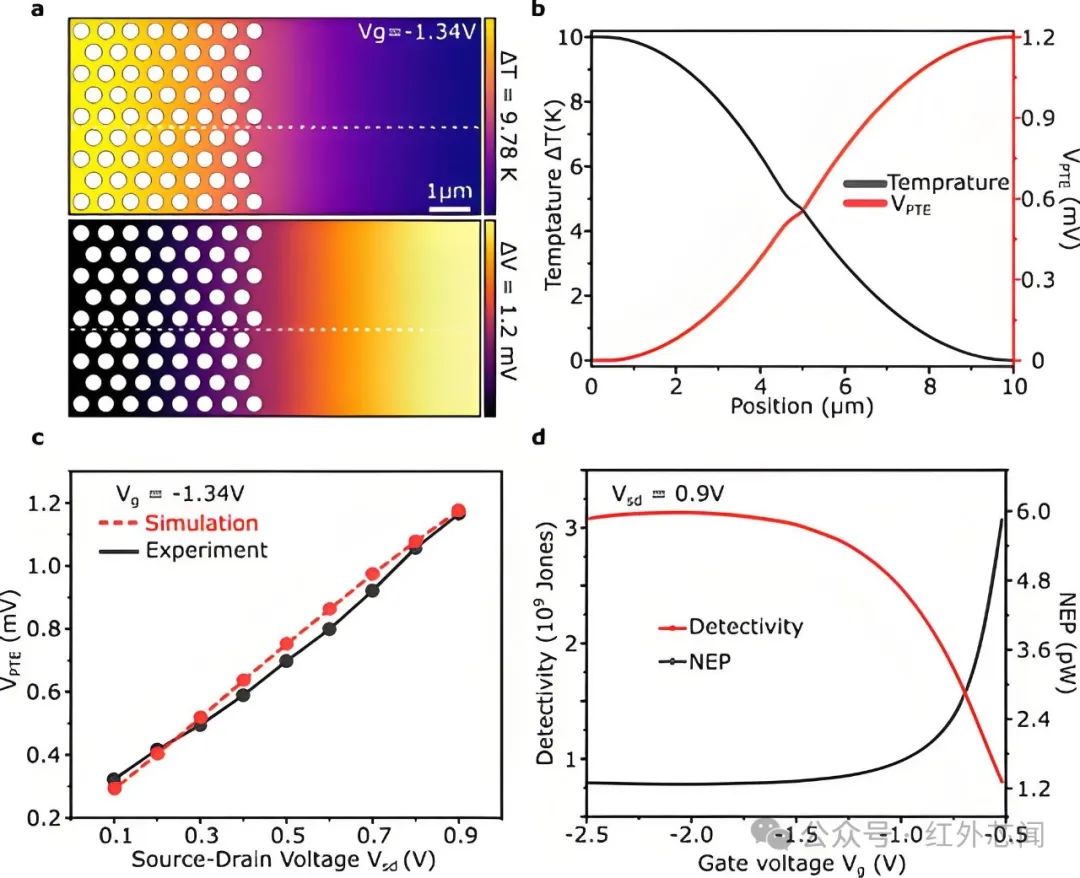 随后,研究人员将对该探测器的探测结果与使用COMSOL Multiphysics的有限元仿真进行了比较。为了评估该石墨烯长波红外探测器的性能,研究人员对其探测率的动态可调性进行了测量,表示为 D*。图3D绘制了D*和噪声等效功率(NEP)相对于栅极电压的关系。