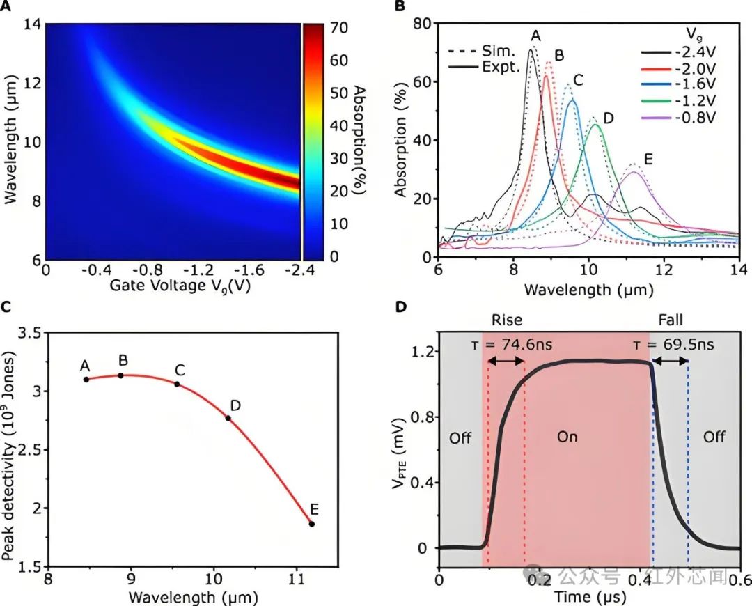 最后,研究人员研究了基于单层石墨烯的室温长波红外探测器的动态光谱可调性,相关结果如图4所示。实验结果进一步证明了基于石墨烯的室温长波红外探测器在大气透明窗口上的动态光谱可调性。