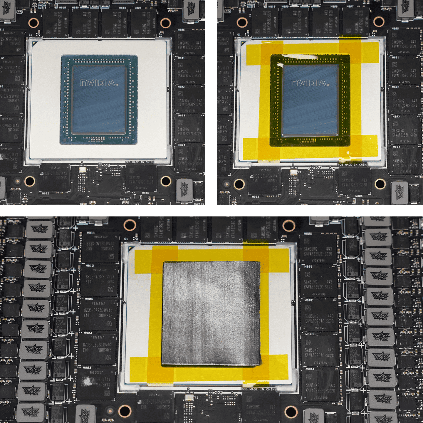 在使用时,用户应首先彻底清除 GPU 芯片及周围区域的油脂;然后沿着芯片边缘平齐贴附 TG Kapton 绝缘片(此时应确保绝缘片不延伸至 GPU 区域);最终贴上 KryoSheet 导热垫本体。