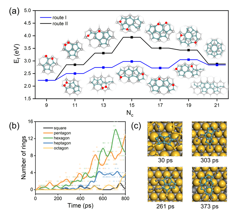 从最稳定的C6团簇出发,通过计算稳定结构的反应活性位点,提出了两种可能的成核模式:(i)低能量的纵向成核模式,以边缘五元环为核心,主要通过逐步添加C2单元来扩展共轭,沿衬底的<100>方向生长;(ii)高能量的圆周成核模式,克服衬底限域,形成富含六元环的核壳状结构。混合蒙特卡洛-分子动力学模拟的结果进一步验证了所提出的成核路径。成核前期,五元环的数量始终超过六元环,六元环的增加与五元环的减少显著相关,表明五元环在石墨烯的早期生长阶段起主导作用。此外,模拟过程中也捕捉到了成核路径中的典型结构特征。