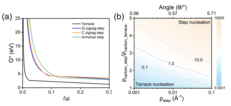进一步,研究了衬底台阶对碳团簇稳定性及石墨烯形核的影响。发现相比于不同类型原子台阶附近的碳团簇,位于平台表面的碳团簇具有更低的形成能,意味着原子台阶并非能量最优的石墨烯形核位点。基于经典成核理论,分别计算了石墨烯在平台表面和台阶边缘的临界成核能垒,并构建了不同碳前驱体浓度分布及衬底表面原子台阶密度下的石墨烯形核相图。发现在衬底表面碳前驱体浓度较均匀的条件下,石墨烯倾向于在台阶表面形核,而实验中普遍观察到的台阶边缘成核应是由台阶边缘处的局部碳前驱体浓度较高导致的。结合进一步的计算,文章提出可通过近平衡生长环境实现碳浓度在衬底表面的均匀分布,避免台阶聚束,实现在SiC(0001)衬底表面生长高质量的单层石墨烯。这项工作深化了人们对二维晶体在衬底表面成核机制的理解,并有助于指导实验可控生长高质量二维晶体。