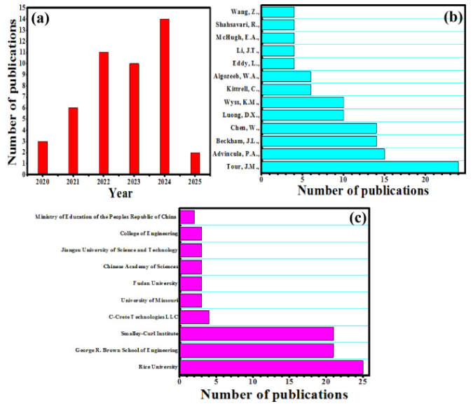 图1.过去四年发表的 FG 文章数量 (a),以及对这些出版物的主要贡献研究人员 (b) 和研究机构/大学 (c)。