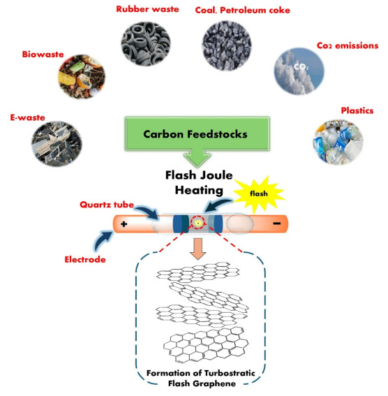 在废料升级再造的背景下,FJH 已经发展成为一种新技术,可以通过将塑料等各种不同的废料转化为高质量的FG来彻底改变我们处理各种不同废料的方式。该过程包括在几毫秒内将废料置于快速、高温的放电下,通常在 2,500 至 3,000 摄氏度之间。这种突然的加热和快速冷却导致材料内的碳原子重新排列成涡轮层石墨烯结构,与传统的AB堆叠石墨烯层相比,这种结构更易于调整、管理和易于剥离 。因此,FJH有助于在很短的时间内以最低的能耗有效地将废物转化为有价值的产品。