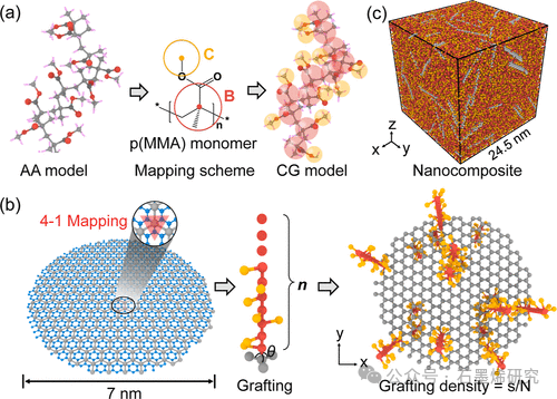 Fig 1. (a) 粗粒化(左)全原子(AA)聚(甲基丙烯酸甲酯)p(MMA)模型到(右)粗粒化(CG)模型,中间面板显示 p(MMA)的化学结构和每个单体两个珠子的映射方案。(b) 制备基本的 p(MMA)接枝石墨烯构建块用于石墨烯/p(MMA)纳米复合材料:(左面板)石墨烯的 CG 模型,每个 CG 珠子(灰色)代表四个碳原子(蓝色),即 4–1 映射方案;(中间面板)p(MMA)接枝过程,其中 n 表示接枝聚合物链长度,θ表示两个结合的石墨烯珠子与一个聚合物珠子 B 之间的角度;(右面板)p(MMA)接枝石墨烯构建块的快照,接枝密度为 g = s/N,其中 s 和 N 分别代表接枝位点的数量和每个石墨烯片的总石墨烯珠子数量,p(MMA)链以相等的概率接枝在石墨烯的两侧。(c) 大块石墨烯/p(MMA)纳米复合材料系统的快照,g = 5%和 n = 30。