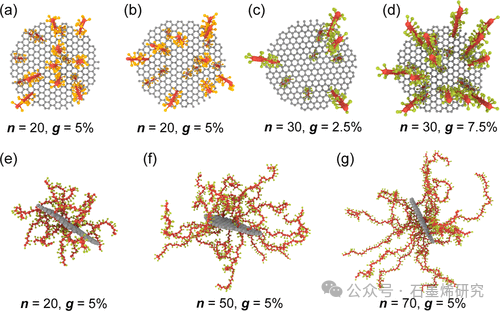Fig 2. 不同配置的 p(MMA)-接枝石墨烯纳米片。(a,b) 不同接枝情景下初始 p(MMA)-接枝石墨烯纳米片的代表性快照,其中接枝密度为 5%,接枝的 p(MMA)链长度为 20。(c,d) 不同接枝密度为 2.5%和 7.5%且接枝链长度为 30 的 p(MMA)-接枝石墨烯纳米片的代表性快照。(e–g) 不同接枝 p(MMA)链长度为 20、50 和 70 且接枝密度为 5%的反应 p(MMA)-接枝石墨烯纳米片的代表性快照。