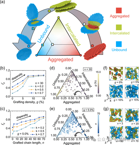 Fig 3. (a) 三元相图以说明石墨烯薄膜的不同分布状态。每个石墨烯薄膜中的 CG 珠子根据不同石墨烯薄膜中 CG 珠子之间的距离被分为聚集态(红色)、插层态(绿色)和未结合态(蓝色)。三元图中描绘了五种代表性的石墨烯薄膜分布,标志着沿逆时针方向分散状态的逐步改善。石墨烯/p(MMA)纳米复合材料系统在平衡阶段的平均 𝑓d⎯⎯⎯⎯fd¯ 值,(b) 在不同的接枝密度 g 和(c) 不同的接枝链长度 n 下,针对不同的 k 值。每个石墨烯薄膜在石墨烯/p(MMA)纳米复合材料中的三元相图[fA, f, fU],具有不同的(d) 接枝密度 g 和(e) 接枝链长度 n,每个点表示一个石墨烯薄膜。石墨烯/p(MMA)纳米复合材料中石墨烯薄膜的代表性形态,(f) 不同接枝密度(即 g = 0.00%、5.00%、10.0%和 15.0%)和(g) 不同接枝链长度(即 n = 3、20、50 和 70)。为了清晰起见,省略了 p(MMA)链。