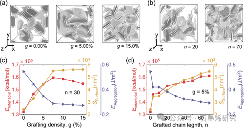 Fig 4. 不同(a)接枝密度和(b)接枝链长度的石墨烯/p(MMA)纳米复合材料中石墨烯簇的高斯密度表面积的演示,其中为了清晰起见省略了 p(MMA)链。石墨烯/p(MMA)纳米复合材料的 EInterfacial、SSurface 和 EAggregation 随(c)接枝密度和(d)接枝链长度的变化。