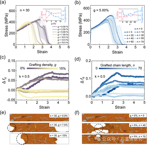 Fig 5. 石墨烯/p(MMA)纳米复合材料的应力-应变曲线,(a) 不同接枝密度 g (n = 30) 和 (b) 接枝链长度 n (g = 5.00%)。误差带来自于沿 x、y 和 z 方向的独立拉伸测试。插图显示了石墨烯/p(MMA)纳米复合材料的杨氏模量 (E) 和韧性。石墨烯/p(MMA)纳米复合材料的分散性 fd (k = 0.5) 随应变的变化 (c) 在固定 n、变化 g 的情况下,以及 (d) 在固定 g、变化 n 的情况下。纳米复合材料在应变为 3 时的快照,(e) 不同接枝密度和 (f) 接枝链长度。