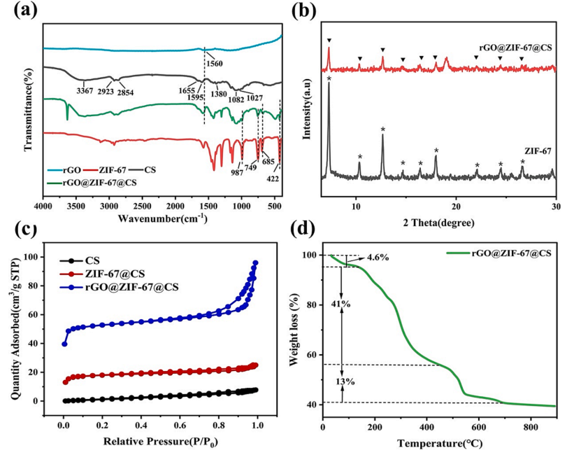图2 (a)ZIF-67、rGO、CS、ZIF-67@CS和rGO@ZIF-67@CS的FTIR光谱;(b)rGO@ZIF-67@CS和ZIF-67的XRD谱图;(c)的N2吸附-解吸CS等温线,ZIF-67@CS,rGO@ZIF-67@CS;(d)rGO@ZIF-67@CS的TGA曲线