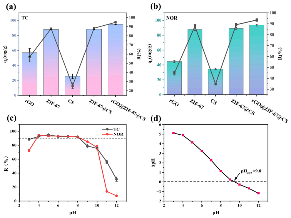 图3 (a)不同吸附剂(pH=4、C0=50mg/L、T=303K对TC的吸附量和去除效率,(b)不同吸附剂(pH=4,C0=50mg/L,T=303K)对NOR的吸附量和去除率;(c)pH为3~12(C0=50mg/L,T=303K)时TC和NOR的去除率;(d)rGO@ZF-67@CS的Zeta电位