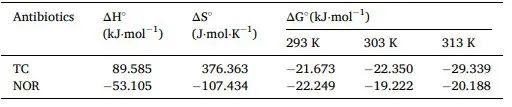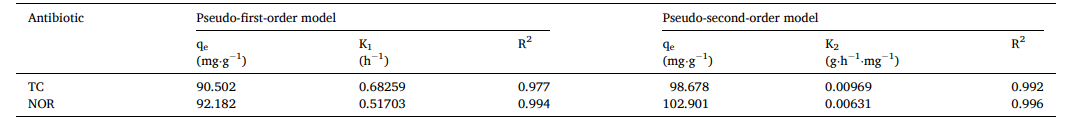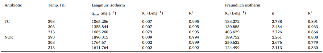 3. TC和NOR的最大吸附量分别为1685.26和1890.3mg/g。