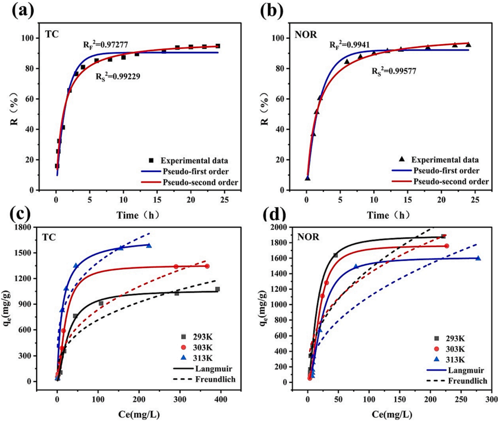 图4 (a)TC吸附动力学曲线(Co=50mg/L,T=303K,pH=5);(b)NOR吸附动力学曲线(C=50mg/L,T=303K,pH=4);(c)不同吸附剂和不同温度下TC的吸附等温线(Co=50-1000mg/L,T=303K,pH=5);(d)不同吸附剂在不同温度下对NOR的吸附等温线
