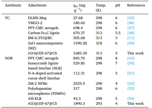 综上所述,我们采用原位合成方法在CS和还原氧化石墨烯凝胶(rGO@ZIF-67@CS)中制备了ZIF-67,并通过FTIR、XRD和SEM-EDS技术对其进行了综合表征。通过考虑各种参数,包括pH、时间、初始TC和NOR浓度,系统地评估了吸附过程。通过动力学研究确定rGO@ZIF-67@CS对TC和NOR的吸附符合准二级动力学模型。等温实验进一步表明,TC和NOR的最大吸附量分别为1685.260mg/g和1890.315mg/g,符合Langmuirt模型。值得注意的是,rGO@ZIF-67@CS显示出同时去除91%TC和80%NOR的能力。此外,热力学研究已经证明了吸附的自发性质,TC表现为吸热过程,而NOR是放热过程。主要的吸附机制是化学吸附,由氢键、络合反应等相互作用驱动。此外,rGO@ZIF-67@CS表现出良好的可回收性。该方法对实际渭河水样中混合污染物的去除效果良好。