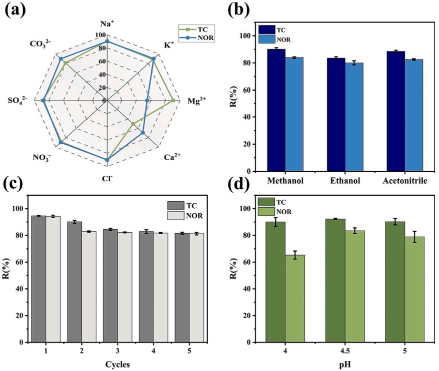 图5 (a)rGO@ZIF-67@CS对TC和NOR(C0=50mg/L,pH=5,pH=4,盐浓度0.5mol/L,T303K,m/V=0.5g/L)的选择性吸附能力;(b)不同解吸剂作用下的再吸附效率;(c)rGO@ZIF-67@CS吸附-再生循环;(d)不同pH(Co=50mg/L TC+50mg/L NOR,T=303K,m/V=0.5g/L)二元体系的去除率。