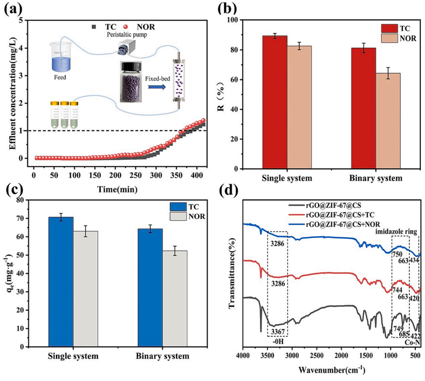 图6 (a)rGO@ZIF-67@CS填充分离柱去除TC和NOR的突破曲线(mo=20mg/L,R=1.25mL/min,m=100mg,pHTc=5,pHNoR=5,T=室温);(b)静态实验中模拟医疗废水中TC和NOR的去除效率(mo=50mg/L,ma=0.5g/L,pHTc=5,pHNoR=4,pHTC+NOR=4.5,T=30℃);(c)动态实验四环素和诺氟沙星在单双体系(mo=20mg/L,m=100mg,pHTc=5,pHNoR=4,pHTc+NOR=4.5,T=室温)中的吸附量;(d)rGO@ZF-67@CS吸附TC和NOR前后的FTIR光谱。