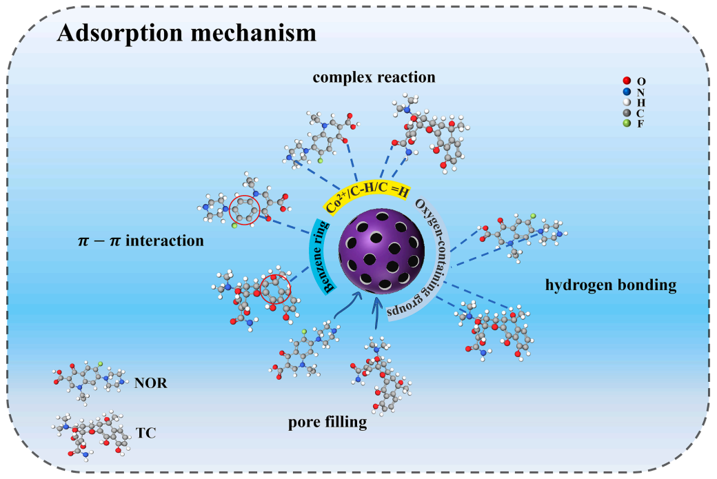 4. 孔隙填充、键合、络合和π-π堆积有助于rGO@ZIF-67@CS吸附TC和NOR。