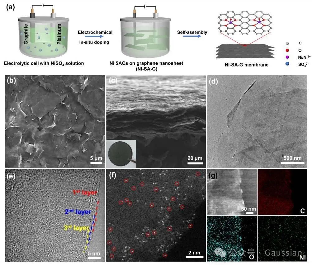 图1.(a)Ni-SA-G膜的制备示意图。(b)Ni-SA-G膜的俯视SEM图像以及(c)其横截面SEM图像;Ni-SA-G样品的(d)TEM图像、(e)HR-TEM图像、(f)AC-HAADF-STEM图像,以及(g)相应的EDS元素分布图。