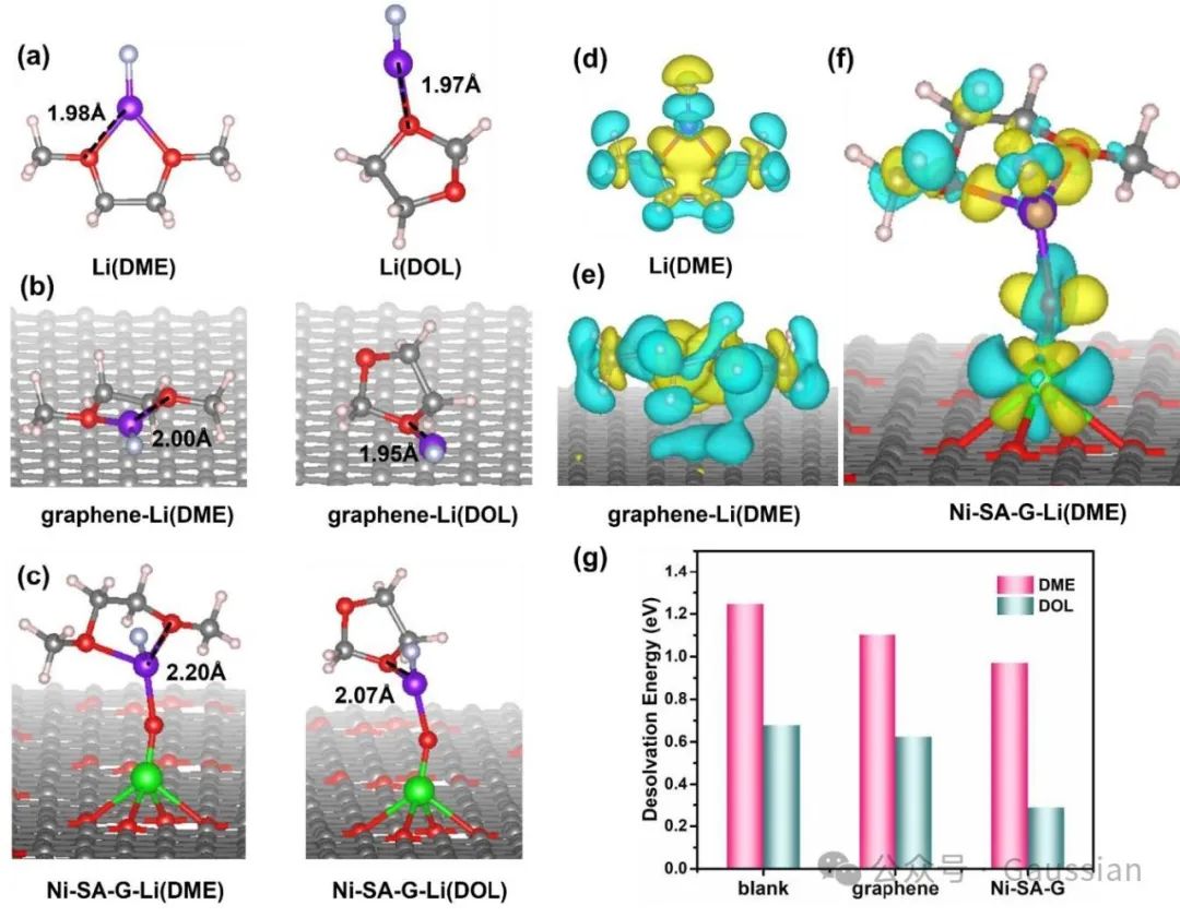 图3.分别在(a)LE中、(b)石墨烯基底上以及(c)Ni-SA-G基底上优化后的Li+溶剂化结构。(d-f)为Li+在不同基底上溶剂化时相应的电荷密度差异。(g)Li+在不同基底上的去溶剂化能。图中粉色、紫色、灰色、红色和绿色的球体分别代表H、Li、C、O和Ni原子。
