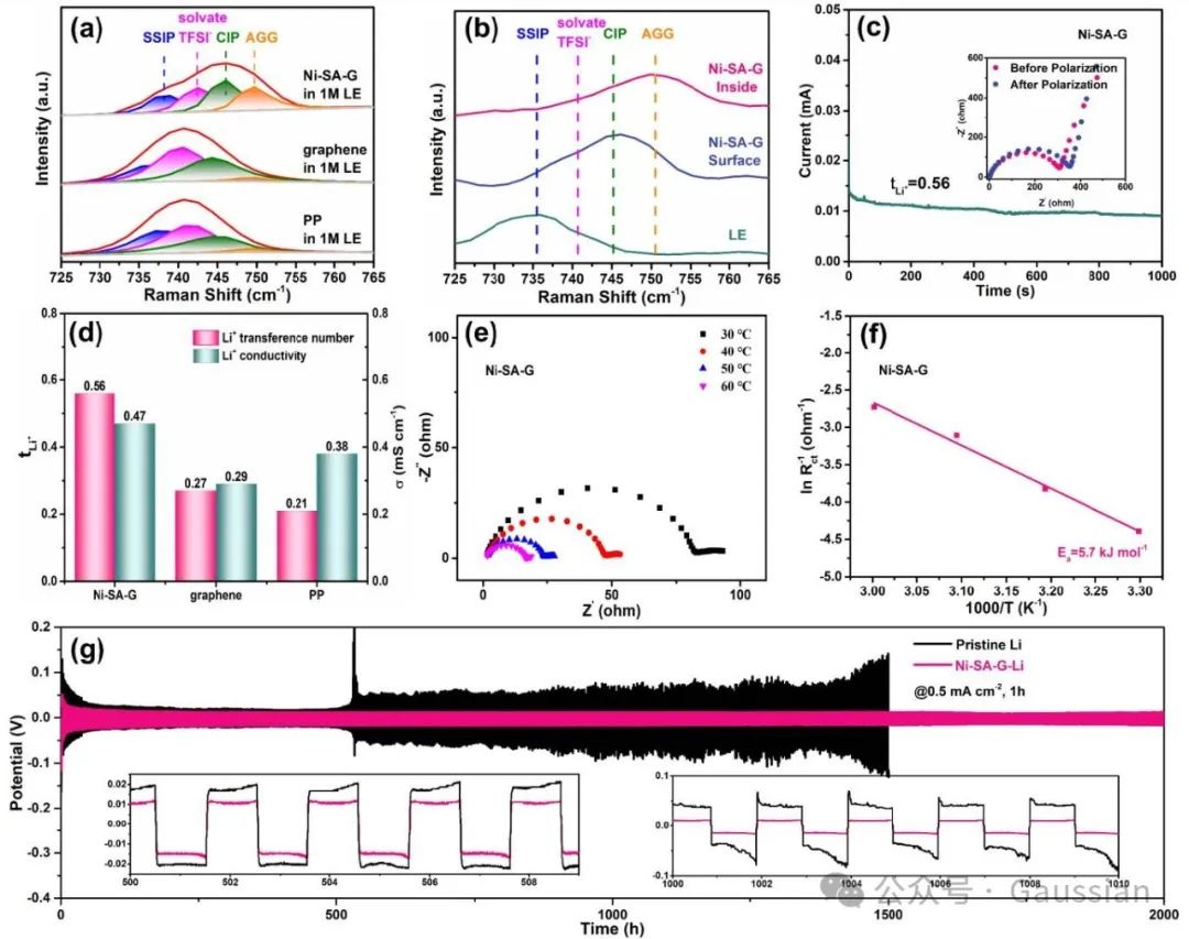 图4.(a-b)1M LE中各种隔膜的拉曼光谱。(c)Ni-SA-G体系下的Li+迁移数。(d)基于不同隔膜的Li+迁移数和Li+电导率的比较。(e)Ni-SA-G改性隔膜在不同温度下的EIS测试结果。(f)由EIS曲线计算得到的阿伦尼乌斯图。(g)Ni-SA-G-Li和原始Li电极在0.5 mA cm⁻²电流密度下的恒电流电镀/剥离稳定性。