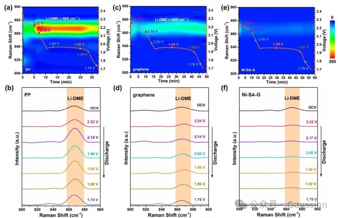 图5.采用(a-b)PP隔膜、(c-d)石墨烯隔膜以及(e-f)Ni-SA-G改性隔膜时的原位拉曼等高线图以及相应的拉曼光谱。