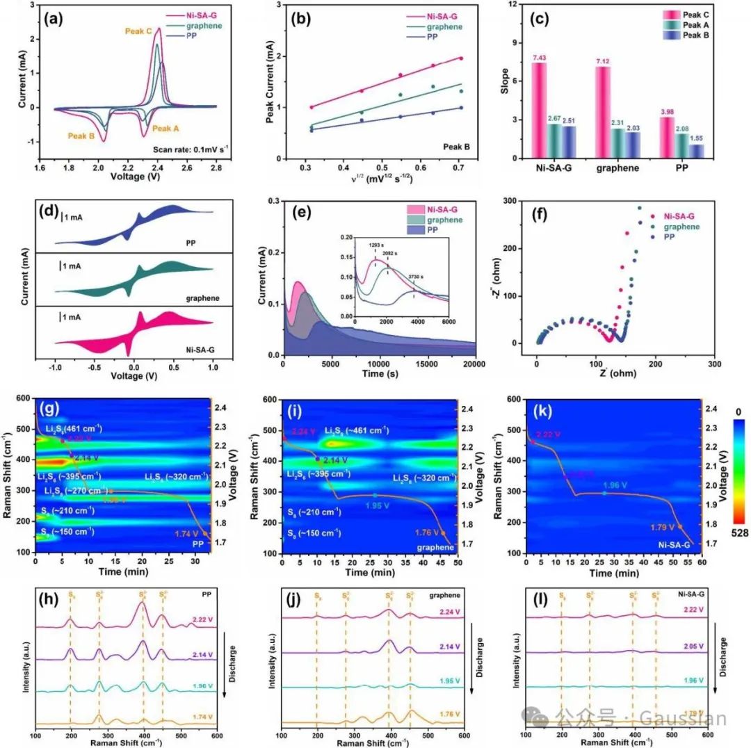 图6.(a)组装好的采用不同隔膜的Li-S电池的CV曲线。(b)峰电流与扫描速率平方根(ν¹/²)的关系图。(c)相应的斜率柱状图。(d)电解液中含有Li₂S₆的对称电池的循环伏安曲线。(e)Li₂S成核的恒电位放电曲线。(f)循环前电池的EIS。采用(g-h)PP隔膜、(i-j)石墨烯隔膜以及(k-l)Ni-SA-G隔膜时的原位拉曼等高线图以及相应的拉曼光谱。