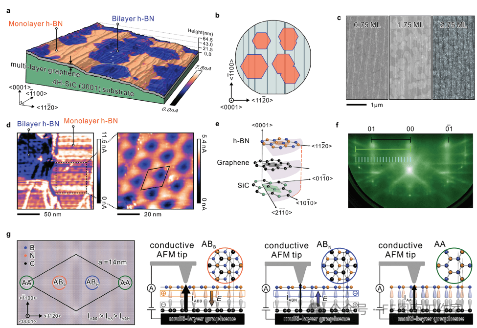 图1:a) 单层与双层h-BN的导电原子力显微镜(cAFM)电流图及形貌;b) 单层h-BN覆盖石墨烯台阶的SEM图像;c) h-BN跨台阶连续生长的SEM图;d) 单层h-BN/graphene界面莫尔超晶格的cAFM电流图;e-f) 石墨烯基底的RHEED衍射条纹;g) DFT计算的电荷分布(ABB、ABN、AA堆叠)。
